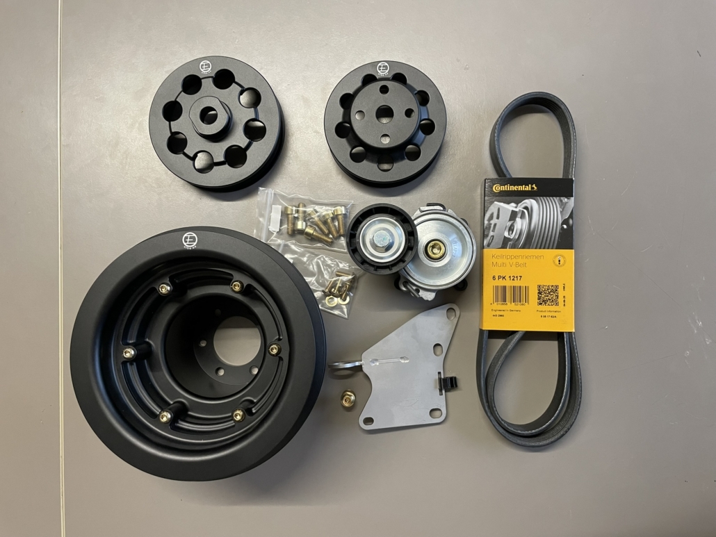Crankshaft+water pump+power steering pump pulleys – 6 rib belt instead of V belt design. Automatic belt tensioner can be used if SLS/hydraulic pump is not fitted.